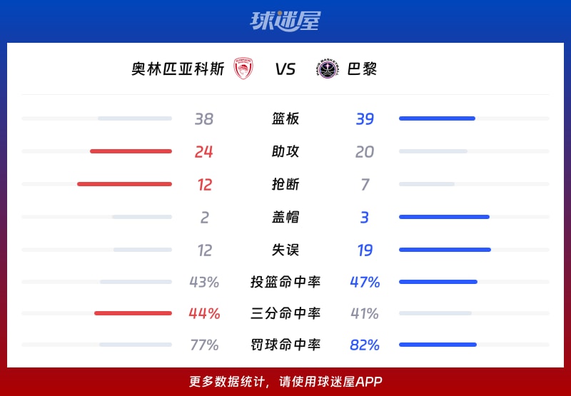 巴黎:得分86、篮板39、助攻20、抢断7、盖帽3、失误19、投篮命中率47%、三分命中率41%、罚球命中率82%
