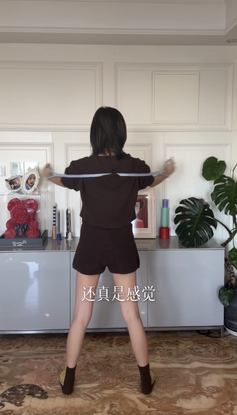 在家里穿着针织套装,棕色短裤配一双地板袜,显得双腿又细又长。173cm的身高果然很优越,单是背影就很耐看。